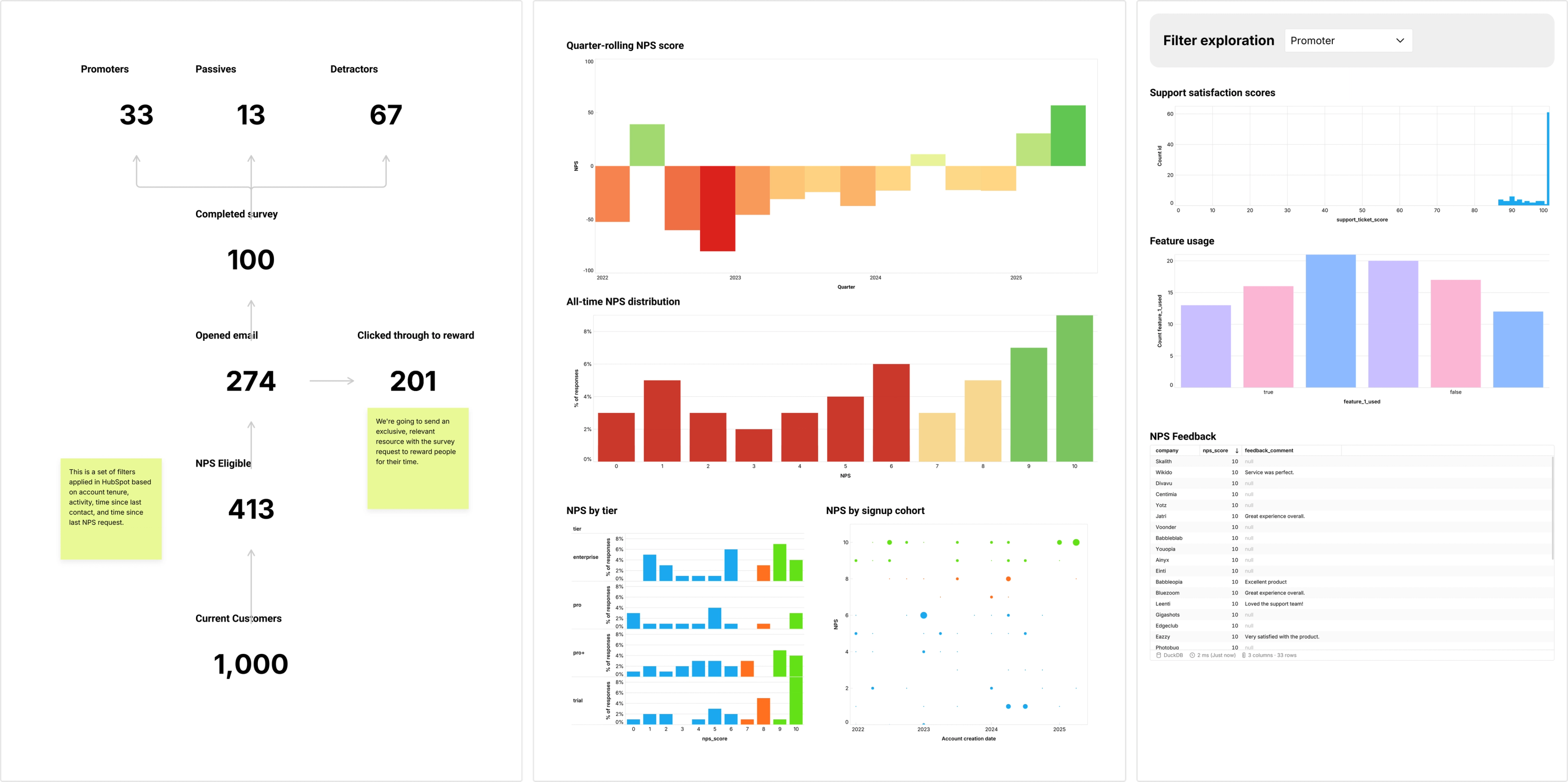 Drop your NPS scores—promoters, passives, detractors—right next to signup cohort breakdowns, customer tier segments, feature usage patterns, and support ticket resolution satisfaction. All pulling from your data warehouse where your survey tool (Survicate, Delighted, whatever exports to BigQuery) dumps responses automatically.