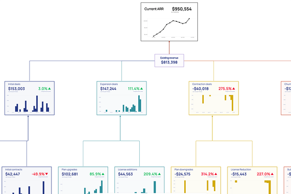 A simple metric tree breaking down revenue into typical B2B SaaS components of new business, expansion, contraction, and churn.